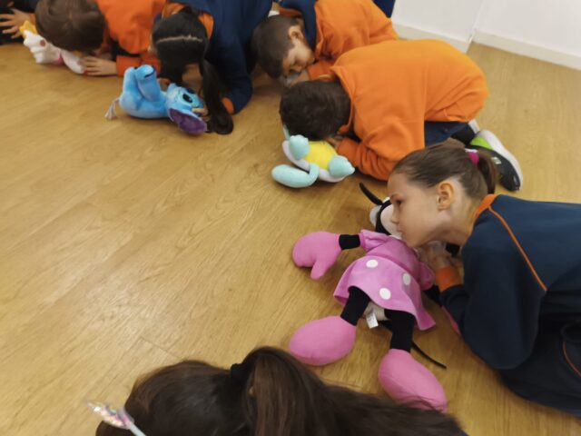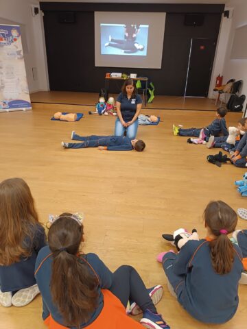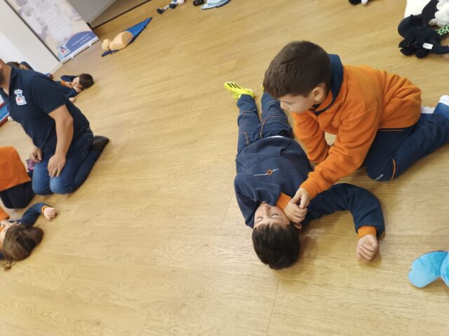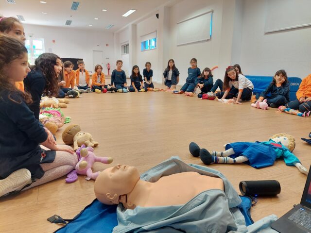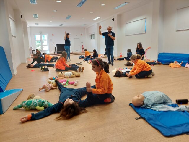 Os alunos aprenderam como avaliar se a vítima está a respirar, através do VOS (ver, ouvir e sentir) para saberem como devem atuar. Com os colegas treinaram a posição lateral de segurança, que devem usar quando a vítima se encontra inconsciente mas a respirar, e com os peluches praticaram