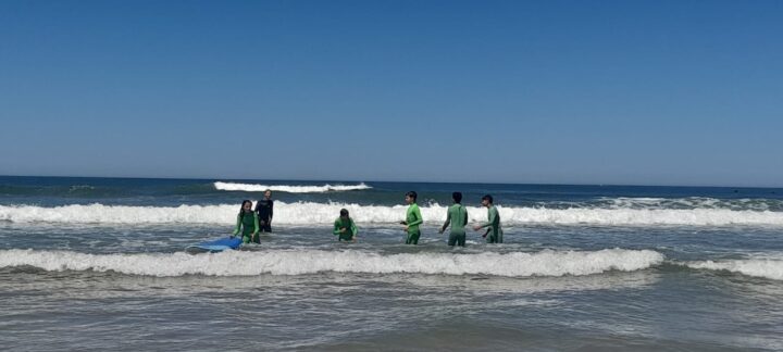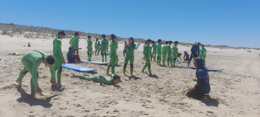 Após uma curta viagem de barco e uma caminhada, os alunos tiveram oportunidade de fazer uma aula de surf, na Gala.