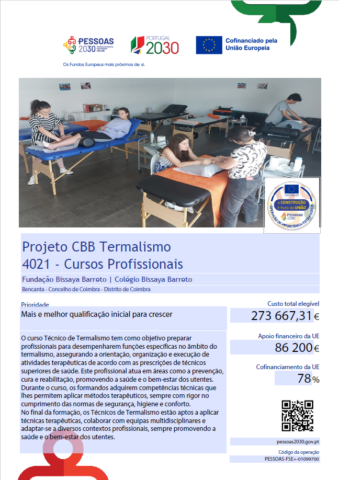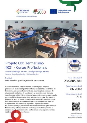 Durante as aulas práticas, os formandos têm a oportunidade de realizar atividades diretamente nas Termas de Luso, onde praticam as técnicas terapêuticas em cenários reais e supervisionados. Além disso, utilizam as instalações do Colégio Bissaya Barreto, incluindo a sala de massagem e a piscina, para complementar a sua formação técnica. Este contacto com equipamentos e infraestruturas específicos permite uma integração prática do conhecimento adquirido, preparando os formandos para responder às exigências do mercado de trabalho.